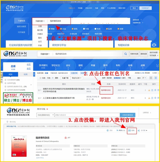 3.在知网主页中,按“文献来源”搜索“临床骨科杂志”,点击来源项目下的任一“临床骨科杂志”进入我刊官网,最后点击右上角的“投稿”